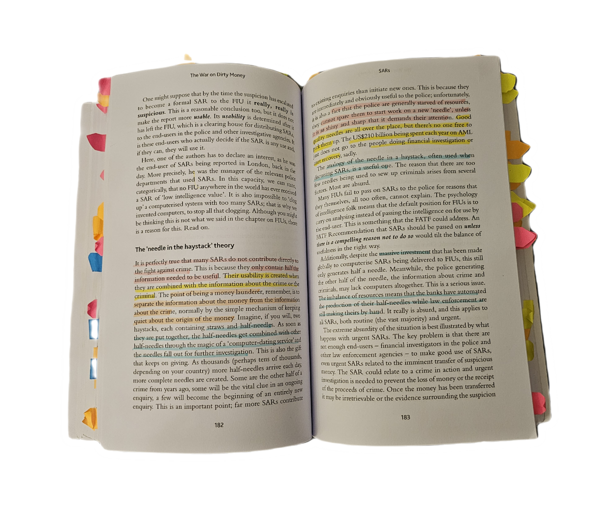 In my viewpoint, the book seems to have overlooked the political dimension of the issue of dirty money. It would be helpful to conduct additional research to explore the intersection of politics and dirty money in greater depth. According to the authors, prevention experts have been using typologies and red flags as a substitute for actual experience. However, I personally disagree with this approach. Whenever I come across an alerted account, I always make sure to question the reasons behind it and carefully analyze if any red flags could be related to the suspicion. In my view, it is not entirely feasible to eliminate the usage of red flags as a measure to prevent money laundering.